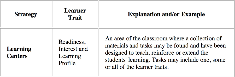 In the second article, written by Marcia Imbeau, the focus is on who, what, and where (Who do you teach? What do you teach? and Where do you teach?). Once the teacher has established the answer to those three key questions, they can then move on the the how (as in How do you teach?). In the how section is where she discusses ways to incorporate differentiated teaching in the classroom. I like that she included the column "learner trait" in order to identify the fact that not all strategies are appropriate in every scenario. Here is an example of how a strategy is outlined in her chart. She has a total of 9 different strategies to chose from.